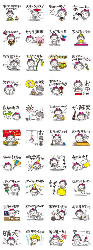 キュートなキャラですね。色んなイベントの時に使えるので一年中活躍できそうなスタンプで気に入りました。