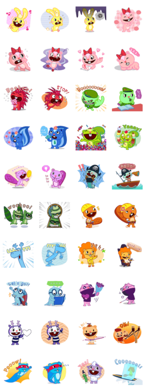 過激な海外Flashアニメ、ハッピーツリーフレンズ(Happy Tree Friends)のスタンプ第2弾が登場!今回はカワイイ系スタンプで、メインキャラクターが全員集合!