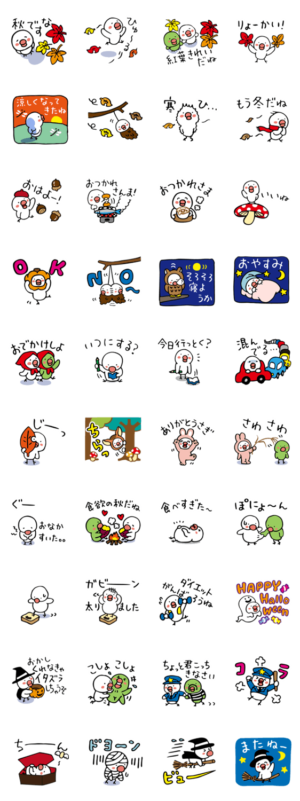 秋の日に使えるスタンプです。紅葉、おでかけ、お月見、食欲&ダイエット、ハロウィンなどなど、秋の日のトークに混ぜてください♪