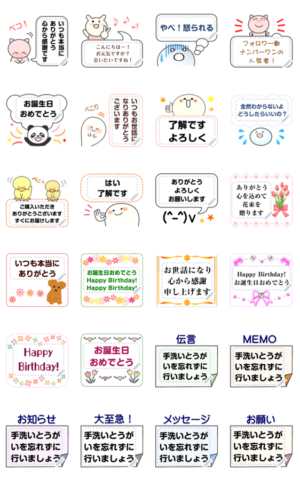 お好きなメッセージ・テキストを自由に入力して使えるスタンプです。可愛すぎないので、女性、男性、シニアでも。使い方は自由で無限大!!