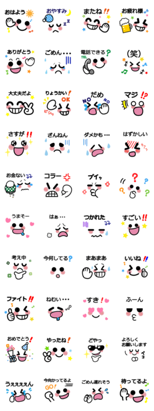 よく使う言葉と顔文字をセットにした毎日使えるスタンプだよ。文字をうつ代わりにスタンプでメッセージを伝えてみてねみかんスタジオ より発売