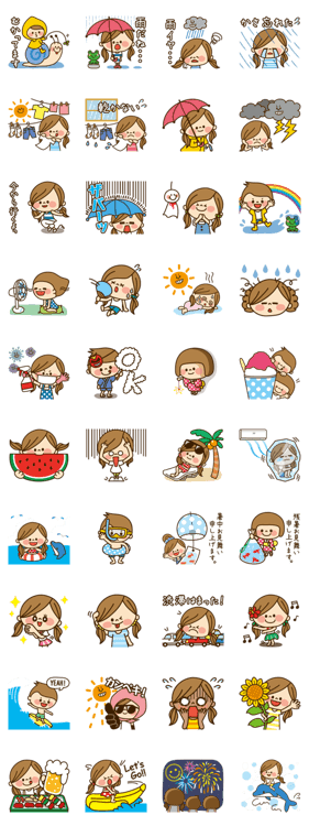 かわいい主婦の1日第4弾【夏編】はかわいい女の子の梅雨&夏スタンプです。パパや家族、ママ友達との毎日の会話にどうぞ。