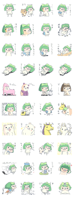 イラストレーター【 ペコ 】スタンプ第14弾!!ティッシュちゃんとこよりちゃんの仲良しスタンプ。パルプタウンの愉快な動物達も登場するハートフルで心温まるスタンプ3