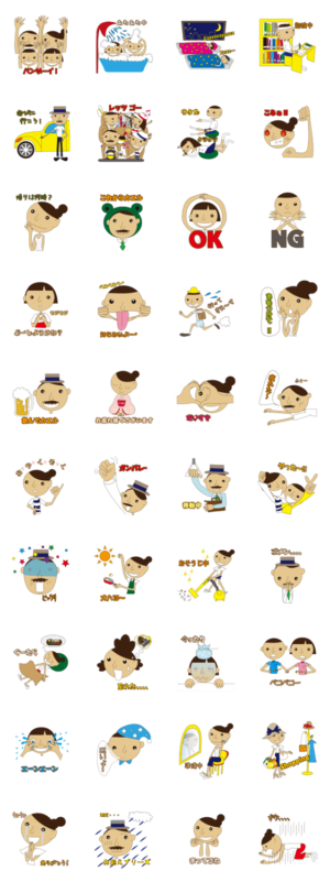 明るく賑やかなスタンプです。手が長いのが特徴ですね、きっと。