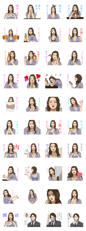 飲みに行こう!スナックやクラブ用、客がママへプレゼント可。バーの店内でスタンプで会話できる。セクシー美人と酒とカラオケ。サラリーマンの癒やしの場。子供はダメよ♪