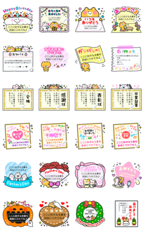 あにまるデコパック第4弾☆自由に文章を入れて作れるメッセージスタンプです。ゆるかわのくま・うさぎ・ネコ・パンダ!お祝い&季節のイベント時にご使用下さい♪ 現在この商品は一部のスマートフォン版LINE 10.3.0以上のトークルームでのみ使用できます。動作環境の最新情報はヘルプをご確認ください。Mie Design より発売