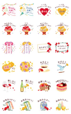 おかあさんとおとうさんに、「ありがとう」の感謝を伝えるスタンプです。カーネーションの花束、バラのくすだま、ハートのフラワーアレンジメントなどでお祝いできます。