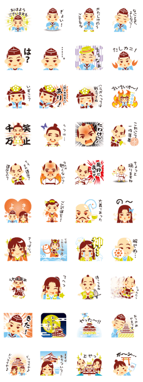 光秀とゆかりの仲間たちのスタンプです。 信長、道三、幽斎、忠興、蘭丸、家康、秀吉…といった戦国武将はもちろん、お城までもが大集合! 歴史、ご当地ネタも満載!