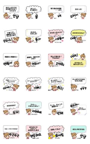 ハングルと日本語のバイリンガルメッセージスタンプ。K popや韓国ドラマが好きな人、韓国語勉強中の人、オリジナルメッセージを添えて送ろう! 現在この商品は一部のスマートフォン版LINE 10.3.0以上のトークルームでのみ使用できます。動作環境の最新情報はヘルプをご確認ください。エツコ より発売