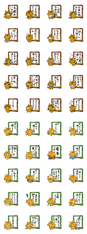家族の間でよく使われる「今から帰ります」「おつかれさま」のスタンプです。あなたの気持ちを伝えてくれるのはチンチラ猫のマックとケン。ふたりの共通の趣味は書道です。