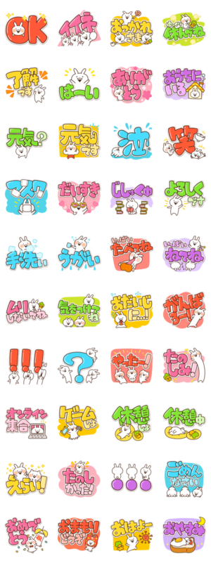 うさぎゅーんのデカ文字スタンプが初登場!!! 大きくて見やすい!カラフル可愛い!相手を気遣う内容多めです!うさぎゅーんと一緒に楽しく過ごしましょ〜!!!