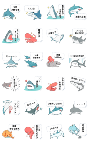 サメとタコのメッセージスタンプです。文字を自由に入力できます。鮫/さめ/たこ/夏/海 現在この商品は一部のスマートフォン版LINE 10.3.0以上のトークルームでのみ使用できます。動作環境の最新情報はヘルプをご確認ください。柴田きいち より発売