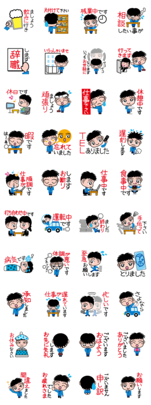 ビジネス挨拶(あいさつ)に便利に使えるイメージを揃えました。会社でビジネスマンがよく会話する内容のスタンプ(男性編)です。