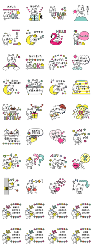 使いやすいスタンプからお祝いに使えるスタンプまで揃っています♪カラフルで派手に可愛くお祝いしてください♪使える敬語も!