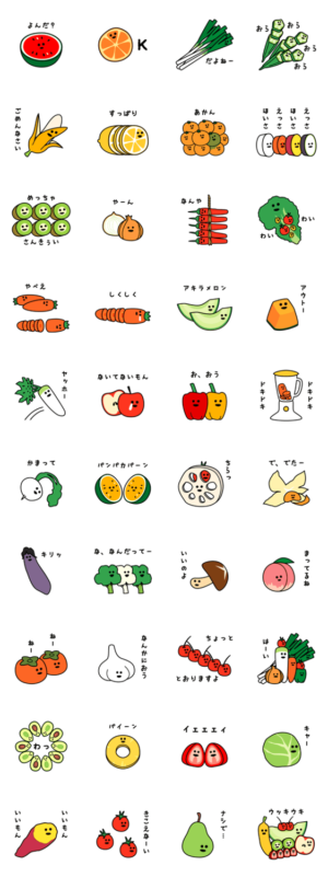 シュールな顔のかわいい野菜と果物(フルーツ)のスタンプです。2EET より発売