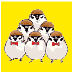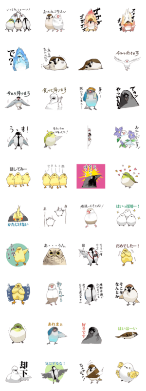スズメ、メジロ、シジュウカラ、シマエナガ、オカメインコ、文鳥、ヒヨコ、ボタンインコ、フクロウ、カラスのスタンプです。シロノ より発売