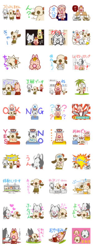 フラダンスが大好きな犬2匹となぜかブタ1匹。可愛くて楽しい、思わずプッと吹き出しちゃうスタンプも満載!これで嵐のごとくスタンプを貼ろう!毎日使えるシリーズ第1弾!WORST より発売