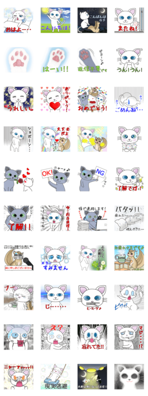 白猫の「ルーナ」、灰色ねこの「シエロ」、シマリスの「チコ」。3匹のユニーク・面白い表情や、リアルに描いた肉球にホッコリされるかも。変顔もあるよ!おゆきさん より発売
