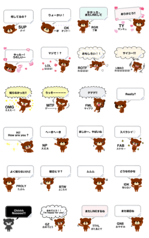 ネットで外国人がよく使う略語とその日本語訳のメッセージスタンプ。外国人の友達に、海外に住んでいる友達に、英語を勉強中の日本人同士でも!SNSでよく使う略語ばかり。 現在この商品は一部のスマートフォン版LINE 10.3.0以上のトークルームでのみ使用できます。動作環境の最新情報はヘルプをご確認ください。エツコ より発売