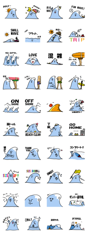 波伝説のスタッフ・サーフアーティスト『KOBU。』による、ゆる~い波のキャラクター。サーフィン仲間との会話に使ってね!Catch the wave!!