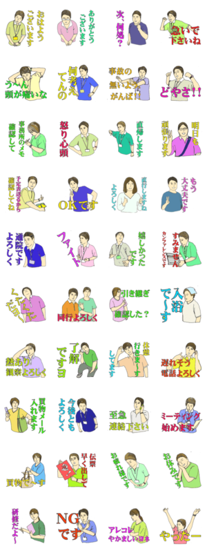 『訪問介護サービス』は、地域の高齢者介護を支える重要な仕事のひとつです。報告、連絡、相談に必要なキーワードをラインスタンプにしました。どうぞ、ご活用下さい。