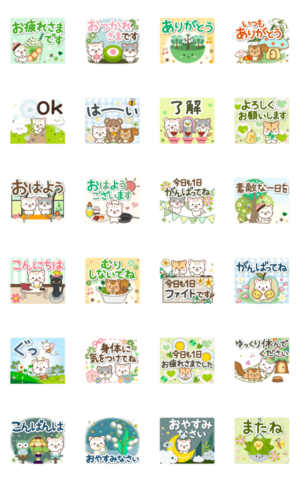 大人のためアニマルズの癒し効果のある緑色を使ったスタンプです。 抹茶スイーツや緑色のフルーツ、グリーンプラントで癒やされませんか。毎日使える挨拶スタンプです。little lion house より発売