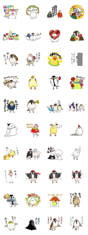スズメ、文鳥、フクロウ、ヒヨコ、セキセイインコのスタンプです。クリスマス、年末年始、ハロウィン、母の日、結婚、誕生日などでお使いください。