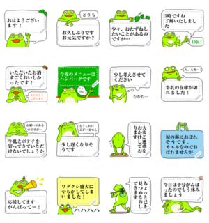 あなたの気持ちを敬語のカエルがお届けします。 現在この商品は一部のスマートフォン版LINE 10.3.0以上のトークルームでのみ使用できます。動作環境の最新情報はヘルプをご確認ください。kotetu23 より発売