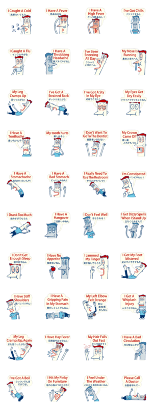 まいど!ジョンやで。使える英語フレーズのパート4や。今回は体調不良をアピールするスタンプばっか集めたったで。具合の悪いとき、できたらつこてな〜♪ほなお大事に〜