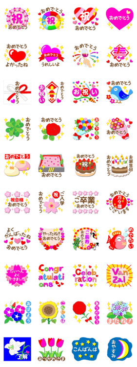 「おめでとう」は、お祝いの言葉です。 スタンプ画像一覧