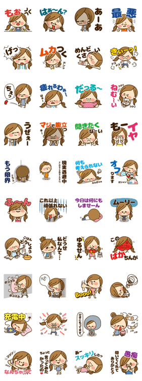 かわいい主婦の1日第12弾【ネガティブ編】はかわいい女の子のネガティブワードスタンプです。イライラを溜め込まず、スタンプで愚痴ってストレス発散しましょう。