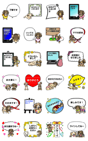 ミニチュアダックスフントの仲良し姉妹みるくちゃんとれもんちゃんのスタンプ第2弾は、メッセージスタンプです。自由に言葉を入れ替えて、お友だちとの会話を楽しんでね! 現在この商品は一部のスマートフォン版LINE 10.3.0以上のトークルームでのみ使用できます。動作環境の最新情報はヘルプをご確認ください。TOM より発売