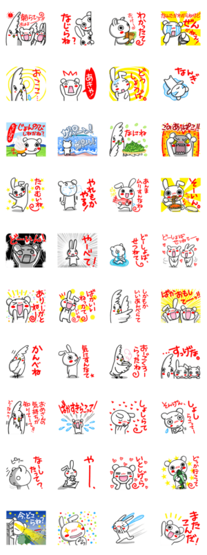 シロクマくん、ウサギさん、オウムさんの日常会話を新潟弁で描いてみました。にぎやかで楽しくカワイイスタンプです。お友達、同僚、ご家族で、どうぞ使ってみてください!