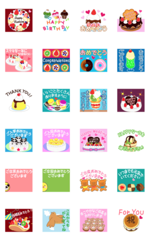 大切な人へのお祝いや誕生日の祝福にカラフルで楽しい至福のスイーツ伝言を贈りましょう♡ずっ~と使える美味しい魅惑のスタンプがたくさん詰まったお得な24個フルセット