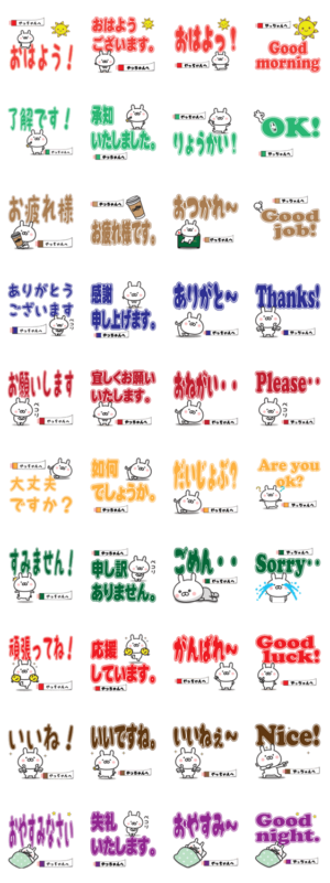 やっちゃんへ送る、シンプルなうさぎのでか文字スタンプです。使用頻度が多いものに絞りました。4パターンの言い方×10通りのセリフを色や文字の形で分けました。