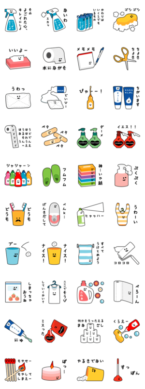 シュールな顔の日用品のスタンプです。トイレットペーパーやティッシュや石鹸などの生活用品たち。2EET より発売