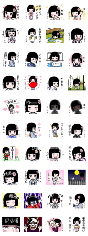 『ぢーちゅ』用のよく使う言葉を詰め合わせた座敷童子のスタンプです。和服 着物 浴衣かがりひな より発売