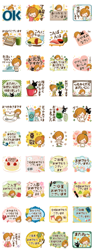 やさしい色合いの「応援」と「お祝い」の言葉がたくさんつまったスタンプです。ほんわか心が癒されますように。「ほのぼのカノジョ」シリーズ