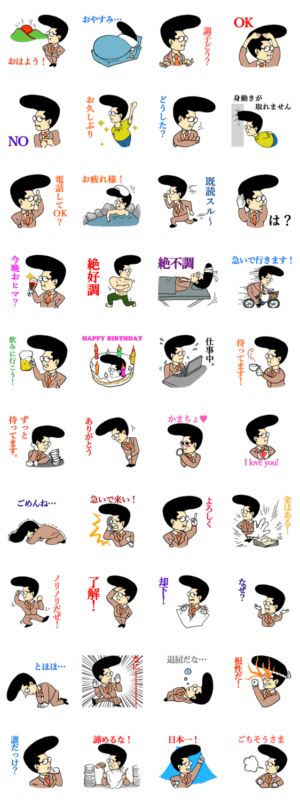 巨大なリーゼントがトレードマークの、ロイヤル社長スタンプ。お茶目な社長・天然な社長・森田社長の日常が垣間見れる縁起の良いスタンプ。人気者になれる事間違いなし!ブランド王ロイヤル より発売