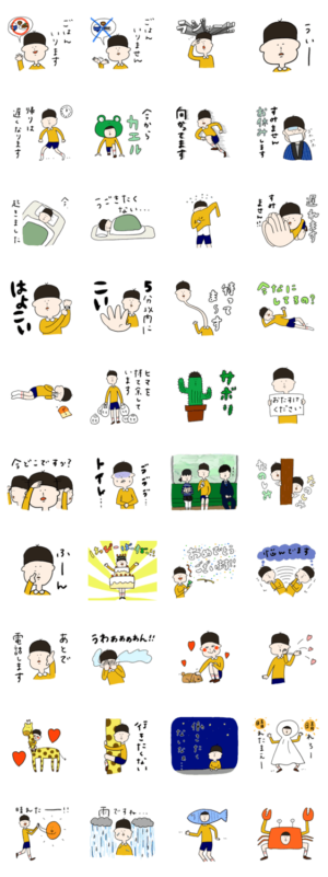 たろうくんの日常スタンプその2。動物を愛でるときだけ開眼します。その他はやっぱりのっぺりしてます。しましま より発売