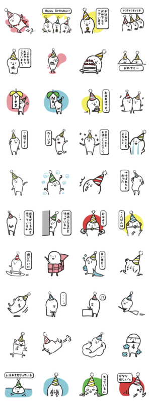 謎の生物がお祝いしてくれます。シュールですが可愛いです。お祝い系が2割程、残りは挨拶やネタ系スタンプですね。