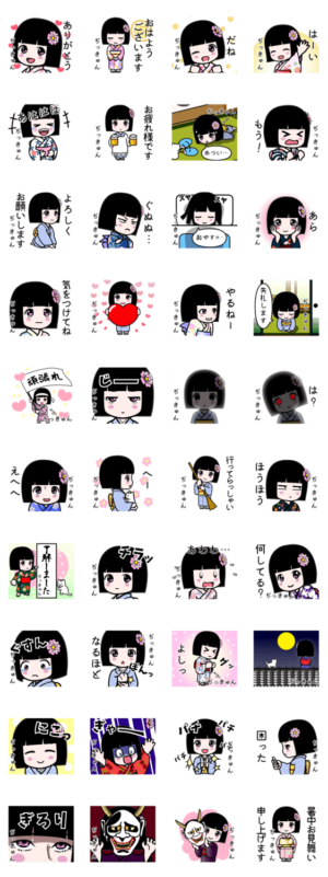 『ぢっきゅん』用のよく使う言葉を詰め合わせた座敷童子のスタンプです。和服 着物 浴衣かがりひな より発売