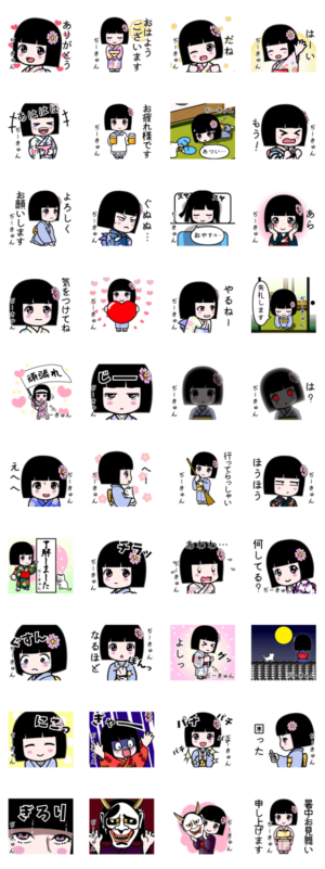 『ぢーきゅん』用のよく使う言葉を詰め合わせた座敷童子のスタンプです。和服 着物 浴衣かがりひな より発売