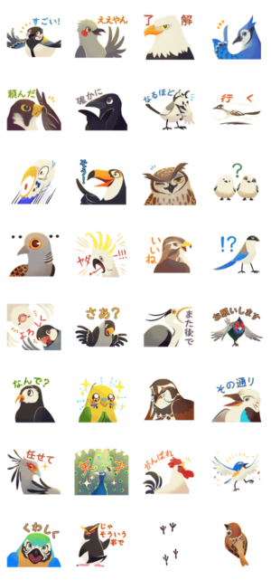 アオカケスをはじめ、文鳥、シマエナガ、スズメ、セキセイインコ、イワトビペンギン、ハクトウワシ、ミミズク、ルリビタキなど様々な鳥たちの、日常で使えるスタンプ