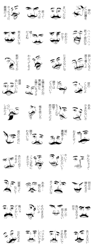 いんろんな表情の男性がスタンプのパート2。お髭の男性がちょっと渋めに、クールに、時にはおちゃめに。ゆっち より発売