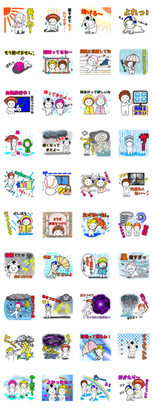 暑い夏のいろいろなシチュエーションに対応したぼーるちゃんたちのスタンプです。大雨や台風を中心にまとめてみました。