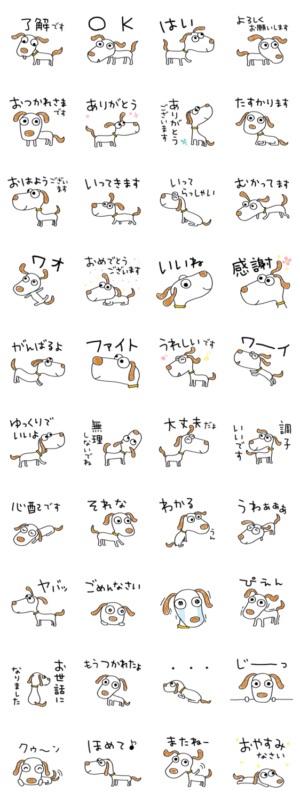 長くて茶色い耳をした犬のウッピー。「OK」「了解」から「おつかれさまです」まで。日常で使いやすい言葉集です。家族、学校、お仕事でどうぞ。