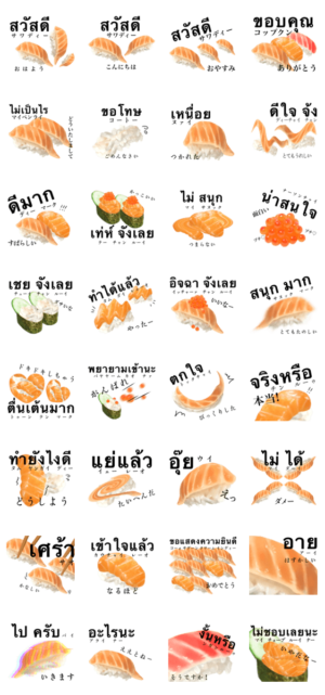 タイ語のお寿司。寿司の中で1番好きなサーモン。「とろサーモン」「厚切りサーモン」以外にあの人気の「イクラ」「まぐろ」も登場。