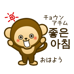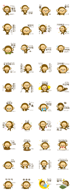 日常で使えるサルの韓国語スタンプなのだ! 読み方と日本語訳付き。ハングルを勉強中の方、韓流・K-POP好きの方にもおすすめ☆猿のスタンプ第15弾☆pekopekoシスターズ より発売