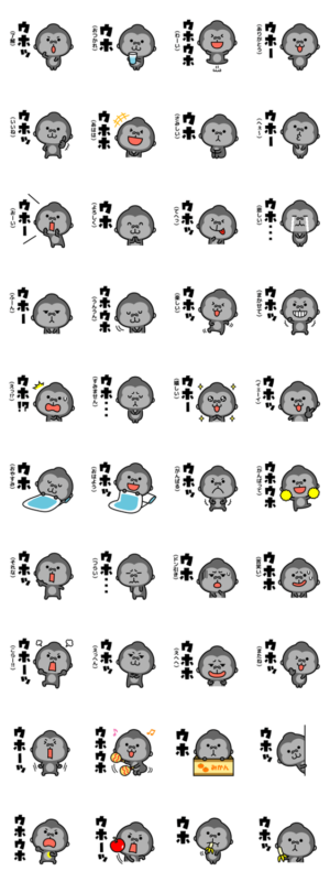 ウホウホ言ってるゴリラのスタンプ。 いろんなウホでコミュニケーションを取ってみよう。おーじろう より発売